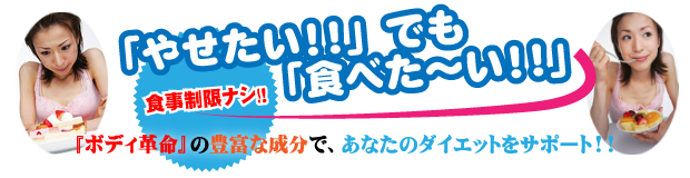 ダイエットとは、本来健康を維持し「バランスの取れた食生活をずっと続ける」ことです。そのためには「食事を楽しむこと」が大切です。「ボディ革命」は、食事制限ナシのダイエットサプリメントです。
